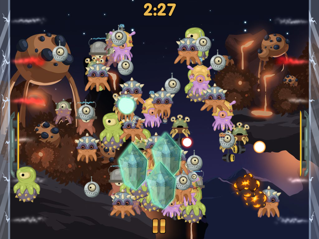 На каждом уровне вас будет ждать область, сверху донизу заполненная враждебно настроенными инопланетными тварями. С боковых сторон экрана, ограниченных стеклянным заграждением, находятся подвижные платформы, которые могут свободно перемещаться вами по вертикальной оси. Также имеется шарик, с помощью которого вы должны отстреливать инопланетян в центре, перебрасывая его от одной платформы к другой, что явственно напоминает нам старый добрый Pong. Особенностью игрового процесса является то, что если шарик пролетит мимо платформ и ударится о стеклянное заграждение в одной и той же точке трижды, то стекло разобьется и шарик улетит в просторы бескрайнего космоса, чего вы допустить не должны, если хотите дойти до победного конца. Вероятность такого исхода не так уж и велика, но все же стоит быть осторожней. За прохождение уровня вам будет вручаться от одной до трех звезд, которые в будущем принесут вам приятные бонусы и выгодные возможности.