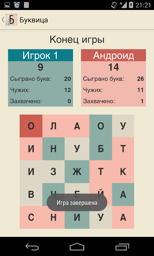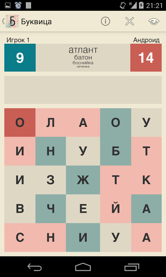 А теперь немного о правилах Буквицы. Игра проходит на поле, размер которого составляет 5х5. Все поле заполнено случайными буквами, из которых необходимо составлять слова. Одно слово может быть использовано лишь единожды за всю игру. Также слово не может быть частью ранее использованного слова. Что касается букв, то на их использование также имеются ограничения – каждая буква не может быть использована второй раз. Игра длится до тех пор, пока все буквы не будут использованы.