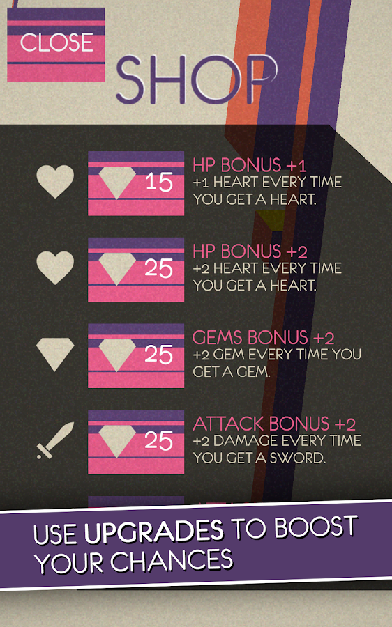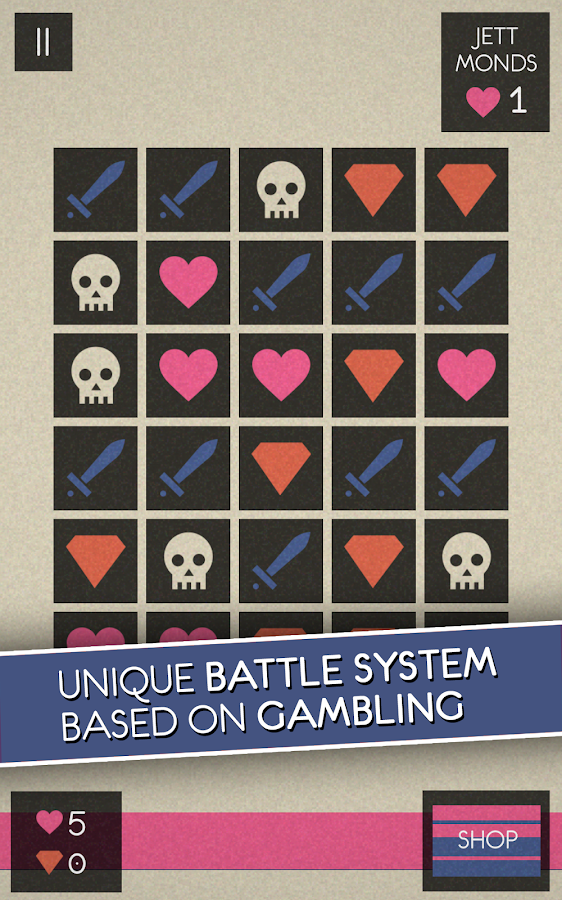 За один ход вы выбираете пять плиток, после чего приложение в случайном порядке выбирает из них ту, которая и решает исход данного хода. Затем все 5 плиток исчезают с игрового поля, а на их месте появляются новые, и так до полной победы или до поражения. Теперь, чтобы все стало на свои места, необходимо разъяснить значение каждой плитки. Меч забирает одну жизнь у противника, череп – у вас. Сердце добавляет вам одну жизнь, кристалл же увеличивает количество ресурсов, за которые можно прокачать своего персонажа.