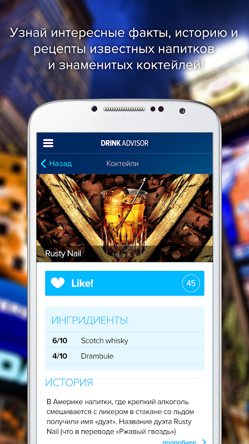 Третья особенность приложения – это наличие информации об известных коктейлях и напитках. Если вы нашли наиболее подходящее заведение, но не можете определиться с заказом – не спешите звать официанта на помощь, просто откройте DrinkAdvisor на своем смартфоне – имеющейся в приложении информации хватит, чтобы выбрать нужный напиток.