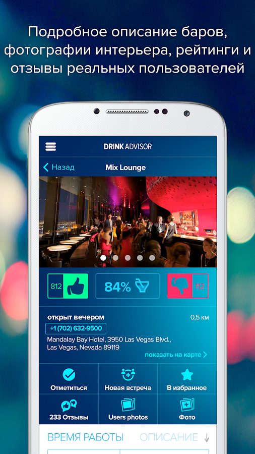 Установив DrinkAdvisor Bars & Nightclubs на свой Андроид, вы превратите устройство в инструмент поиска лучших баров и ночных клубов в более чем 130 городах по всему миру. Москва, Санкт-Петербург, Париж, Лондон, Чикаго, Вашингтон, Лас-Вегас, Нью-Йорк, Сидней, Сан-Франциско и многие другие мегаполисы стали домом для множества хороших заведений, 6000 из которых уже есть в базе данных DrinkAdvisor. При этом добавление новых баров и клубов происходит практически ежедневно, а наиболее понравившиеся заведения можно сохранять для просмотра в офлайне.
