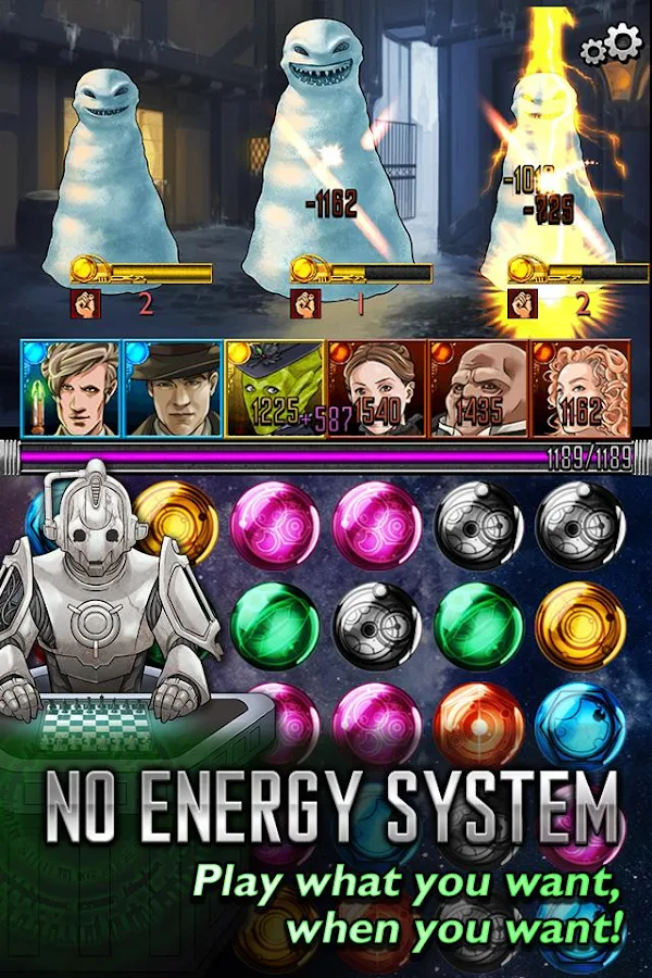 Суть Doctor Who: Legacy заключается в том, что вы выбираете команду и начинаете убирать с поля драгоценные камни. Каждому персонажу соответствует свой цвет. Как только вы убираете несколько одинаковых камней, связанный с ними персонаж атакует. Розовые камни отвечают за лечение всей команды.