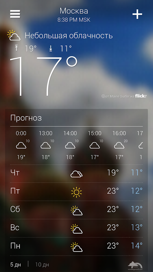 В первую очередь Yahoo! Weather подкупает тем, что для каждой локации приложение использует картинки с высоким разрешением. Вы наверняка уже догадались, что их источником является Flickr - одно из приобретений Yahoo!. К сожалению, такой замечательный фон предусмотрен только для самых крупных городов. Остальные же получают какое-то нейтральное изображение.